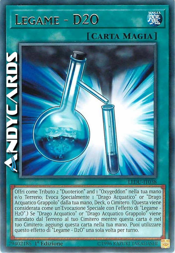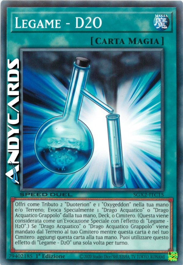Offri come Tributo 2 "Duoterion" and 1 "Oxygeddon" nella tua mano e/o Terreno; Evoca Specialmente 1 "Drago Acquatico" or "Drago Acquatico Grappolo" dalla tua mano, Deck, o Cimitero. (Questa viene considerata come un'Evocazione Speciale con l'effetto di "Legame - H2O".) Se "Drago Acquatico" or "Drago Acquatico Grappolo" viene mandato dal Terreno al tuo Cimitero mentre questa carta è nel tuo Cimitero: aggiungi questa carta nella tua mano. Puoi utilizzare questo effetto di "Legame - D2O" una sola volta per turno.