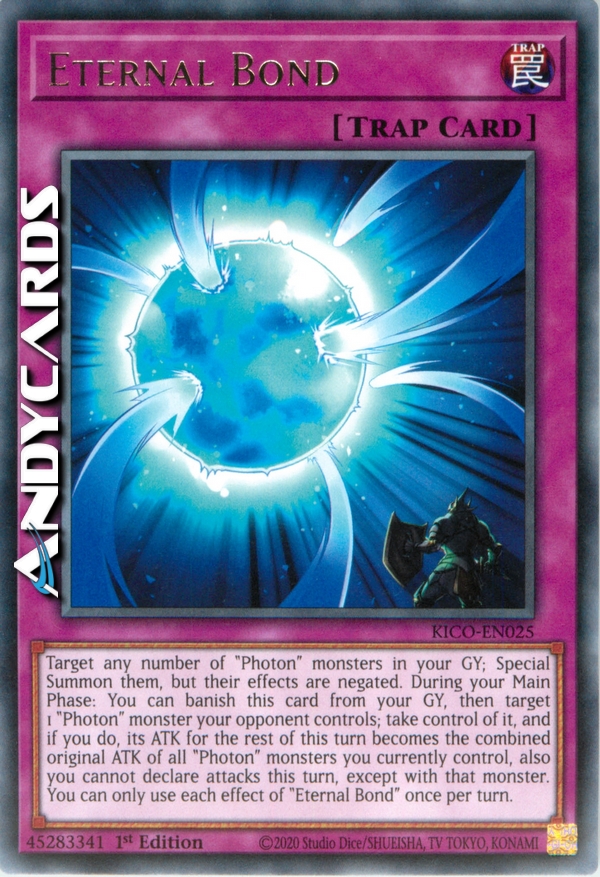 Scegli come bersaglio un qualsiasi numero di mostri "Fotonico" nel tuo Cimitero; Evocali Specialmente, ma i loro effetti sono annullati. Durante la tua Main Phase: puoi bandire questa carta dal tuo Cimitero, poi scegliere come bersaglio 1 mostro "Fotonico" controllato dal tuo avversario; prendine il controllo e, se lo fai, il suo ATK per il resto di questo turno diventa la somma degli ATK originali di tutti i mostri "Fotonico" che controlli attualmente, inoltre non puoi dichiarare attacchi in questo turno, eccetto con quel mostro. Puoi utilizzare ogni effetto di "Legame Eterno" una sola volta per turno.