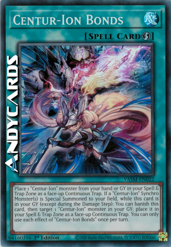 Metti 1 mostro "Centur-Ion" dalla tua mano o Cimitero nella tua Zona Magie & Trappole come una Trappola Continua scoperta. Se uno o più Mostri Synchro "Centur-Ion" vengono Evocati Specialmente sul tuo Terreno, mentre questa carta è nel tuo Cimitero (eccetto durante il Damage Step): puoi bandire questa carta, poi scegliere come bersaglio 1 mostro "Centur-Ion" nel tuo Cimitero; mettilo nella tua Zona Magie & Trappole come una Trappola Continua scoperta. Puoi utilizzare ogni effetto di "Legami Centur-Ion" una sola volta per turno.