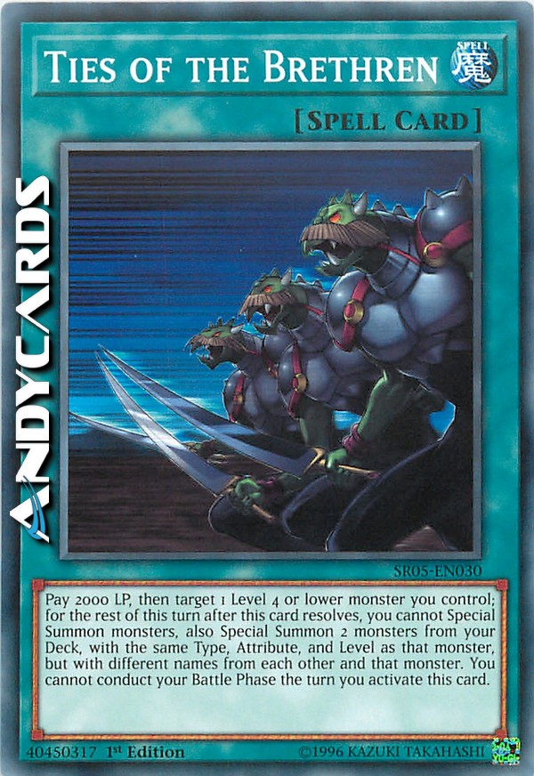 Paga 2000 LP, poi scegli come bersaglio 1 mostro di Livello 4 o inferiore che controlli; per il resto di questo turno, dopo che questa carta si è risolta, non puoi Evocare Specialmente mostri, inoltre Evoca Specialmente dal tuo Deck 2 mostri con lo stesso Tipo, Attributo e Livello di quel mostro, ma con nomi diversi da quel mostro e l'uno dall'altro. Non puoi effettuare la tua Battle Phase nel turno in cui attivi questa carta.