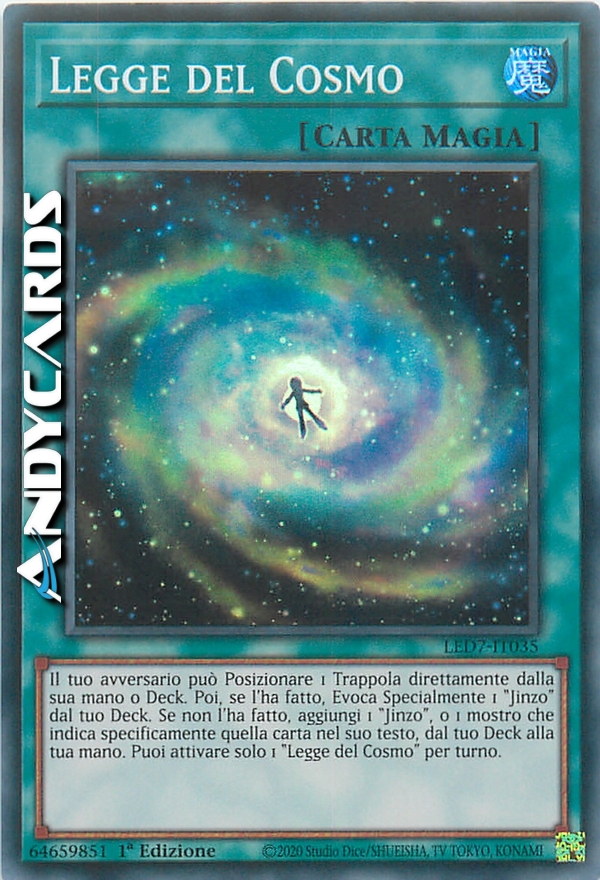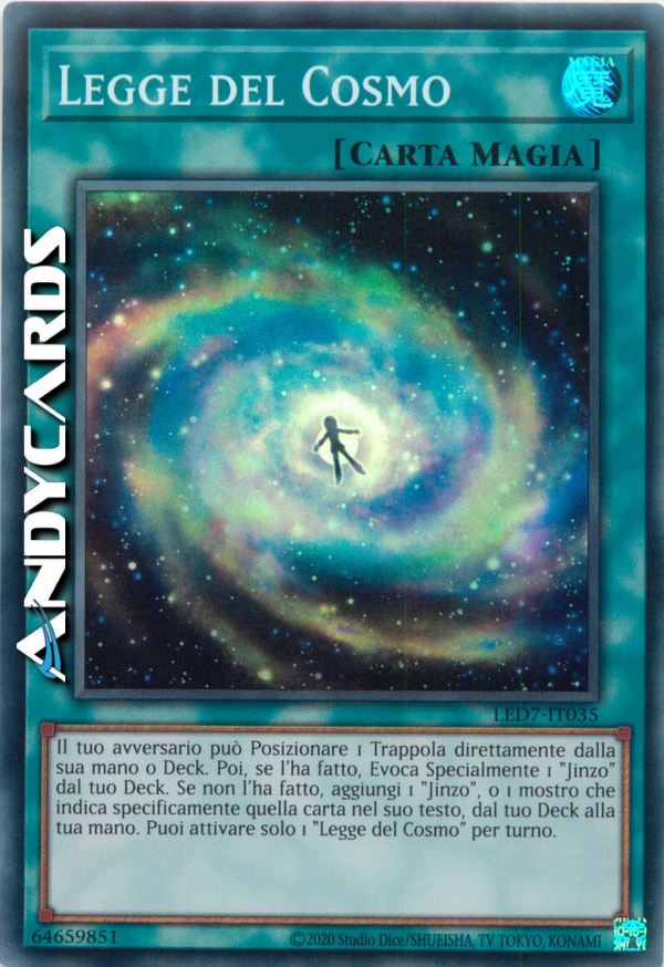 Il tuo avversario può Posizionare 1 Trappola direttamente dalla sua mano o Deck. Poi, se l'ha fatto, Evoca Specialmente 1 "Jinzo" dal tuo Deck. Se non l'ha fatto, aggiungi 1 "Jinzo", o 1 mostro che indica specificamente quella carta nel suo testo, dal tuo Deck alla tua mano. Puoi attivare solo 1 "Legge del Cosmo" per turno.