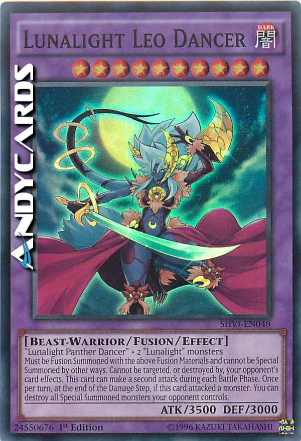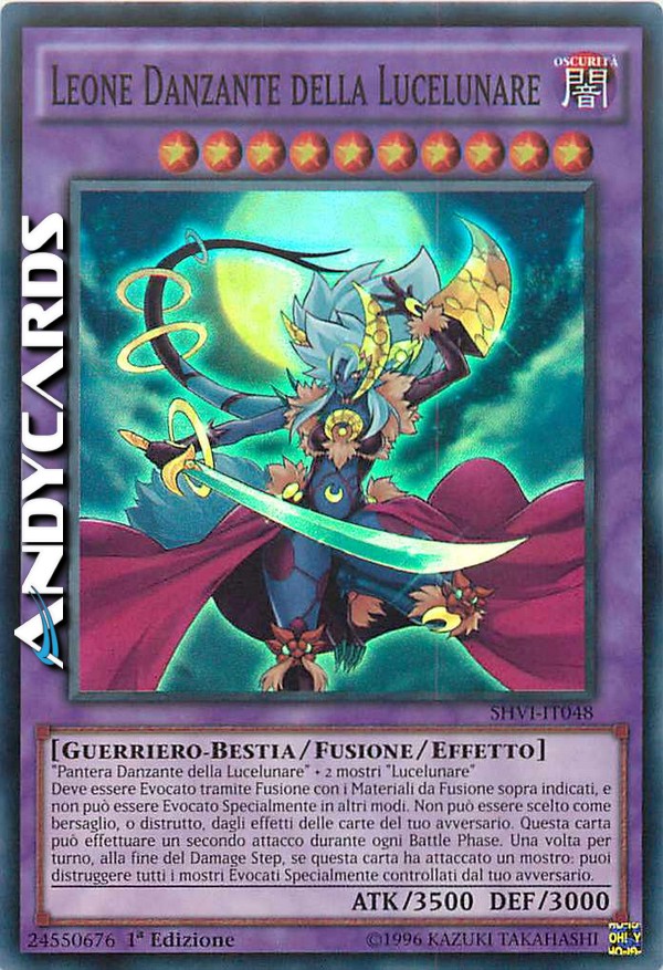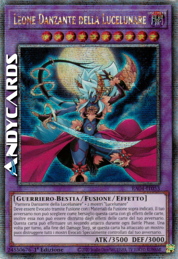 Pantera Danzante della Lucelunare + 2 mostri "Lucelunare" - Deve essere Evocato tramite Fusione con i Materiali da Fusione sopra indicati, e non può essere Evocato Specialmente in altri modi. Non può essere scelto come bersaglio, o distrutto, dagli effetti delle carte del tuo avversario. Questa carta può effettuare un secondo attacco durante ogni Battle Phase. Una volta per turno, alla fine del Damage Step, se questa carta ha attaccato un mostro: puoi distruggere tutti i mostri Evocati Specialmente controllati dal tuo avversario.
