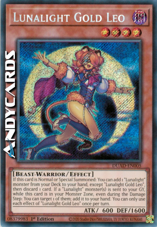If this card is Normal or Special Summoned: You can add 1 "Lunalight" monster from your Deck to your hand, except "Lunalight Gold Leo", then discard 1 card. If a "Lunalight" monster(s) is sent to your GY, while this card is in your Monster Zone, even during the Damage Step: You can target 1 of them; add it to your hand. You can only use each effect of "Lunalight Gold Leo" once per turn.