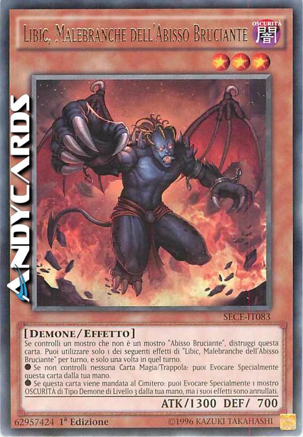 Se controlli un mostro che non è un mostro "Abisso Bruciante", distruggi questa carta. Puoi utilizzare solo 1 dei seguenti effetti di "Libic, Malebranche dell'Abisso Bruciante" per turno, e solo una volta in quel turno.