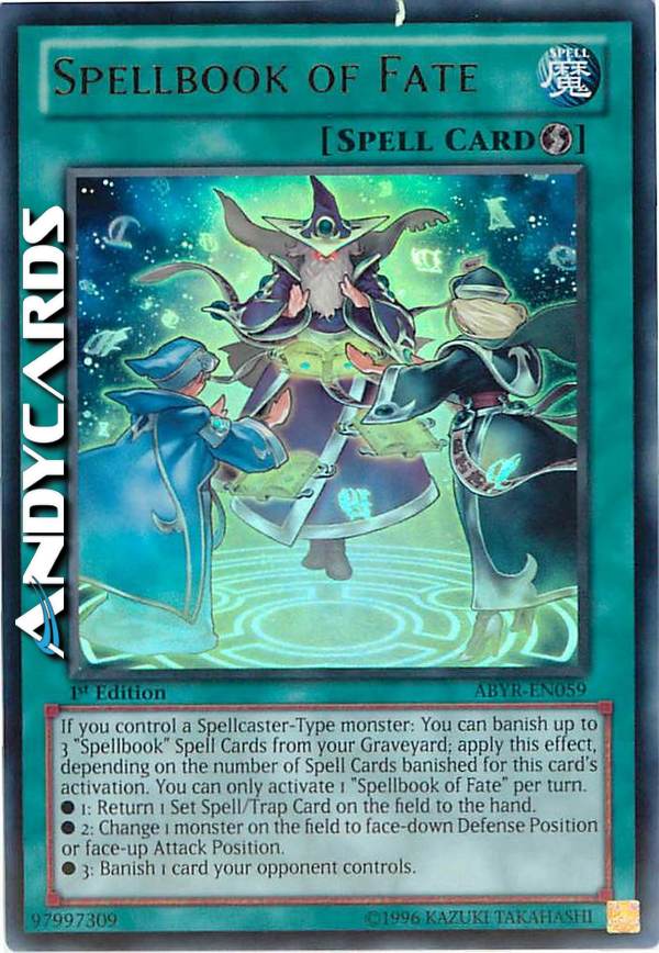 Se controlli un mostro di Tipo Incantatore: puoi bandire fino a 3 Carte Magia "Libro di Magia" dal tuo Cimitero; applica questo effetto, a seconda del numero di Carte Magia bandite per l'attivazione di questa carta. Puoi attivare solo 1 "Libro di Magia del Fato" per turno. ?1: Fai ritornare nella mano 1 Carta Magia/Trappola Posizionata sul Terreno. ?2: Metti 1 mostro sul Terreno coperto in Posizione di Difesa o scoperto in Posizione di Attacco. ?3: Bandisci 1 carta controllata dal tuo avversario.