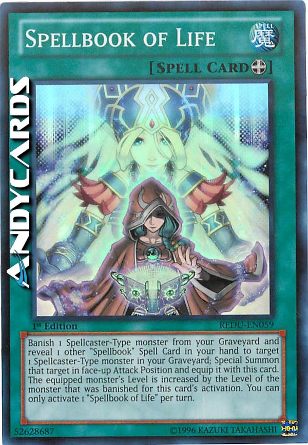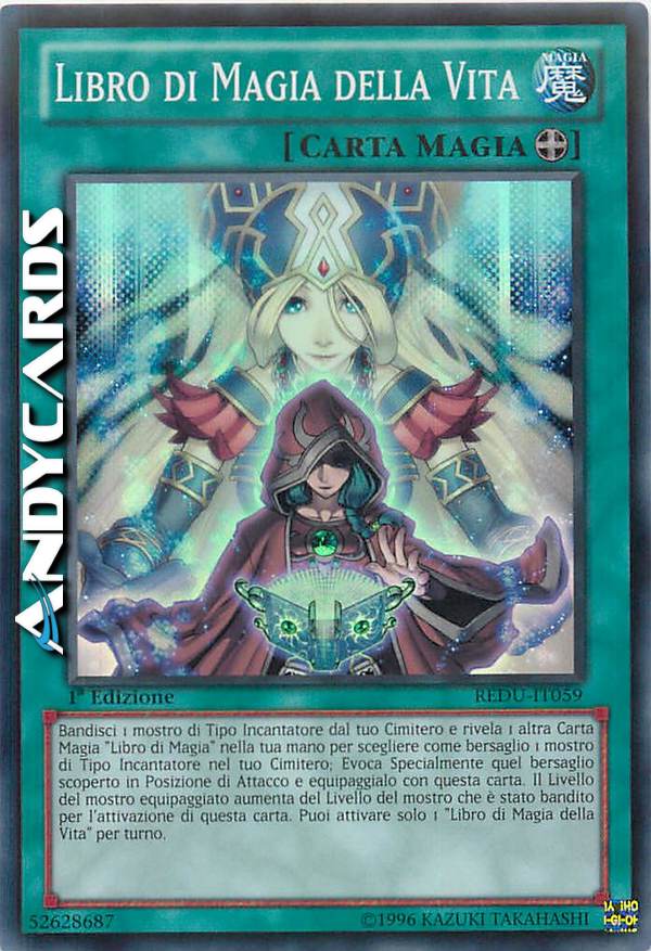 Bandisci 1 mostro di Tipo Incantatore dal tuo Cimitero e rivela 1 altra Carta Magia "Libro di Magia" nella tua mano per scegliere come bersaglio 1 mostro di Tipo Incantatore nel tuo Cimitero; Evoca Specialmente quel bersaglio scoperto in Posizione di Attacco e equipaggialo con questa carta. Il Livello del mostro equipaggiato aumenta del Livello del mostro che è stato bandito per l'attivazione di questa carta. Puoi attivare solo 1 "Libro di Magia della Vita" per turno.