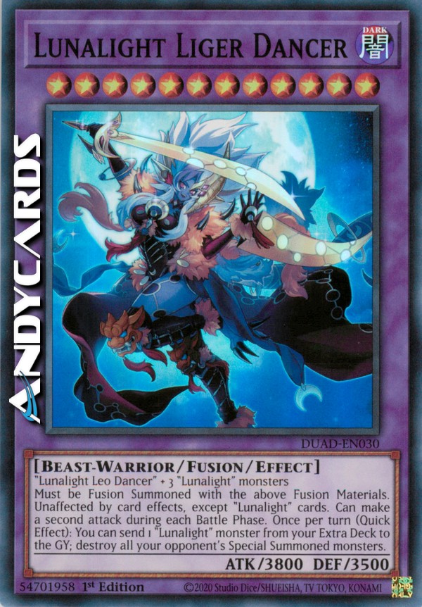 Must be Fusion Summoned with the above Fusion Materials. Unaffected by card effects, except "Lunalight" cards. Can make a second attack during each Battle Phase. Once per turn (Quick Effect): You can send 1 "Lunalight" monster from your Extra Deck to the GY; destroy all your opponent's Special Summoned monsters.