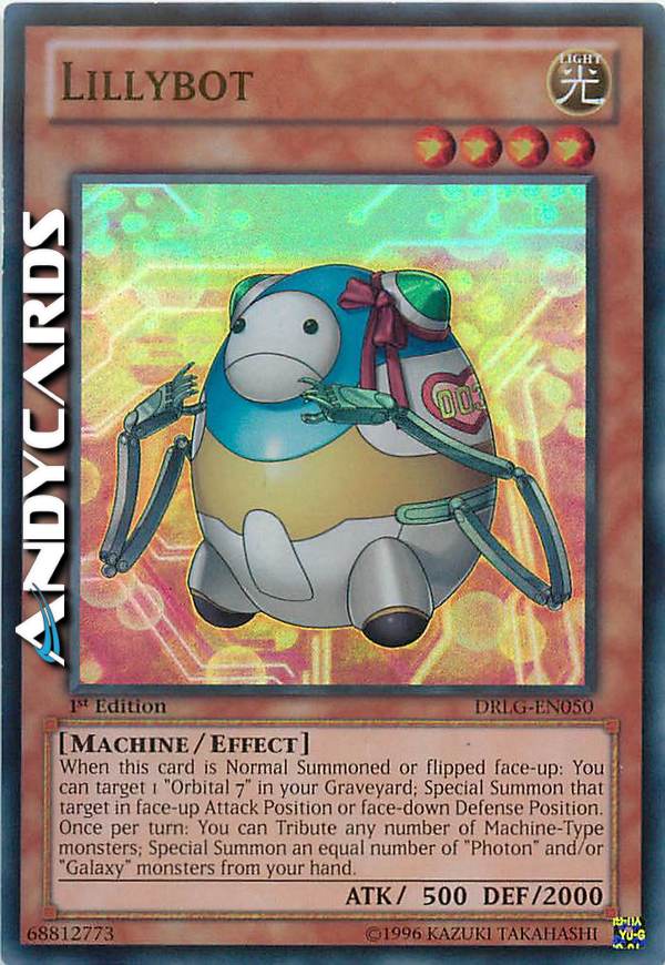 Quando questa carta viene Evocata Normalmente o scoperta : puoi scegliere come bersaglio 1 "Orbitale 7" nel tuo Cimitero; Evoca Specialmente quel bersaglio scoperta in Posizione di Attacco o coperto in Posizione di Difesa. Una volta per turno: puoi offrire come tributo un qualsiasi numero di mostri di TIpo Macchina; Evoca Specialmente lo stesso numero di mostri "Fotonico" e/o "Galattico" dalla tua mano.