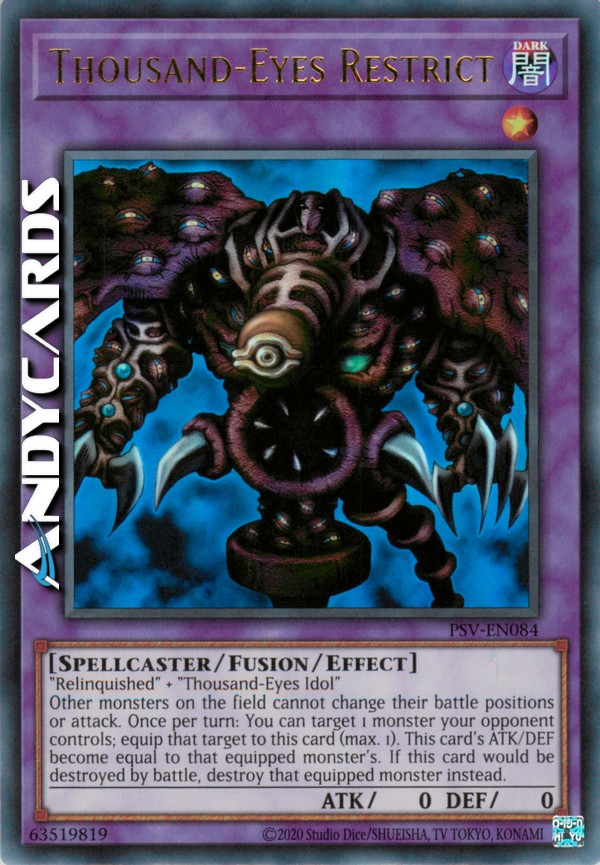 "Relinquished" + "Thousand-Eyes Idol" Other monsters on the field cannot change their battle positions or attack. Once per turn: You can target 1 monster your opponent controls; equip that target to this card (max. 1). This card's ATK/DEF become equal to that equipped monster's. If this card would be destroyed by battle, destroy that equipped monster instead.