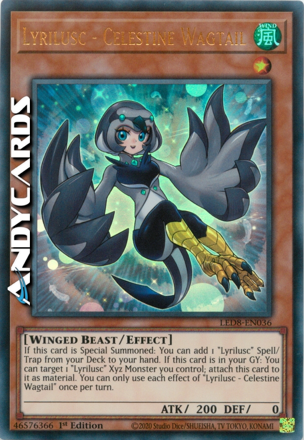 If this card is Special Summoned: You can add 1 "Lyrilusc" Spell/Trap from your Deck to your hand. If this card is in your GY: You can target 1 "Lyrilusc" Xyz Monster you control; attach this card to it as material. You can only use each effect of "Lyrilusc - Celestine Wagtail" once per turn.