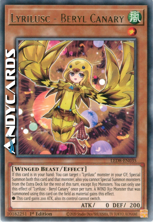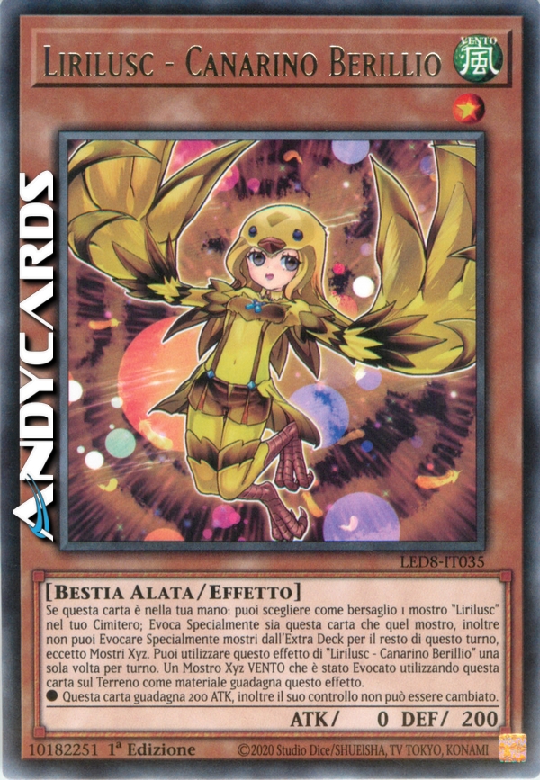 Se questa carta è nella tua mano: puoi scegliere come bersaglio 1 mostro "Lirilusc" nel tuo Cimitero; Evoca Specialmente sia questa carta che quel mostro, inoltre non puoi Evocare Specialmente mostri dall'Extra Deck per il resto di questo turno, eccetto Mostri Xyz. Puoi utilizzare questo effetto di "Lirilusc - Canarino Berillio" una sola volta per turno. Un Mostro Xyz VENTO che è stato Evocato utilizzando questa carta sul Terreno come materiale guadagna questo effetto.