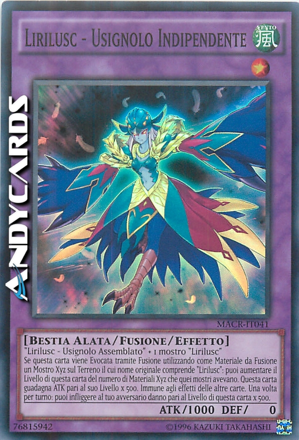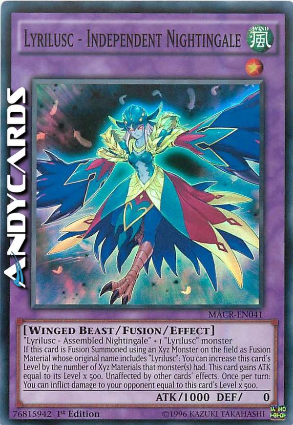 Lirilusc - Usignolo Assemblato + 1 mostro "Lirilusc" - Se questa carta viene Evocata tramite Fusione utilizzando come Materiale da Fusione un Mostro Xyz sul Terreno il cui nome originale comprende "Lirilusc": puoi aumentare il Livello di questa carta del numero di Materiali Xyz che quei mostri avevano. Questa carta guadagna ATK pari al suo Livello x 500. Immune agli effetti delle altre carte. Una volta per turno: puoi infliggere al tuo avversario danno pari al Livello di questa carta x 500.