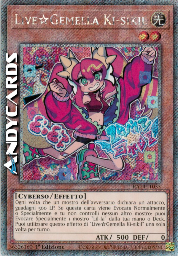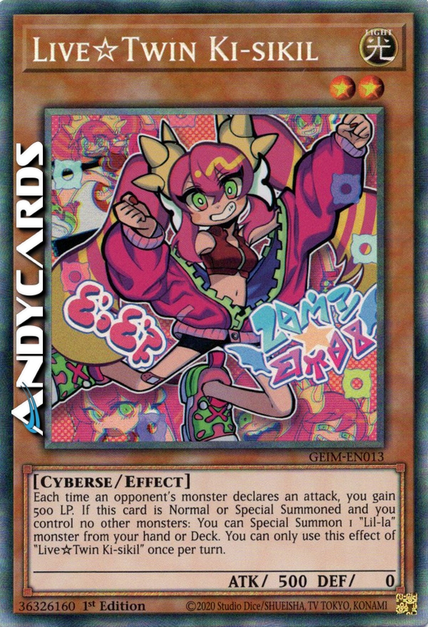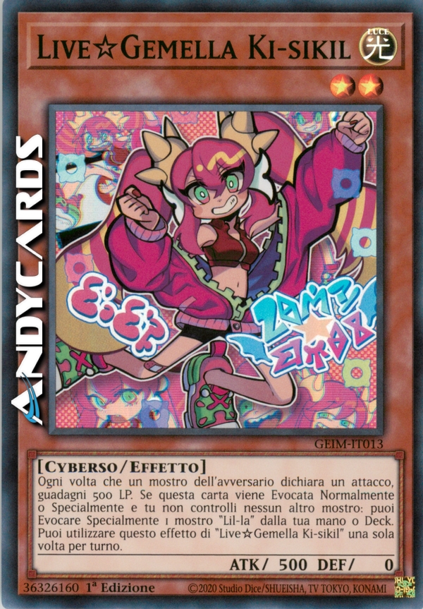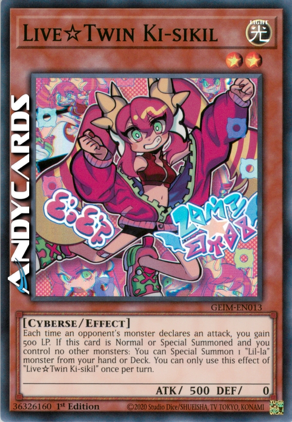 Ogni volta che un mostro dell'avversario dichiara un attacco, guadagni 500 LP. Se questa carta viene Evocata Normalmente o Specialmente e tu non controlli nessun altro mostro: puoi Evocare Specialmente 1 mostro "Lil-la" dalla tua mano o Deck. Puoi utilizzare questo effetto di "Live☆Gemella Ki-sikil" una sola volta per turno.
