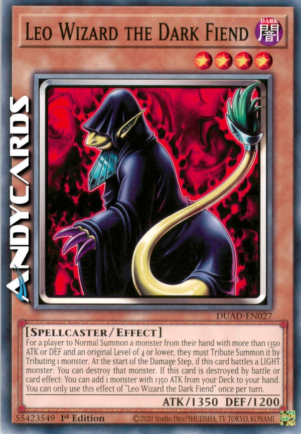For a player to Normal Summon a monster from their hand with more than 1350 ATK or DEF and an original Level of 4 or lower, they must Tribute Summon it by Tributing 1 monster. At the start of the Damage Step, if this card battles a LIGHT monster: You can destroy that monster. If this card is destroyed by battle or card effect: You can add 1 monster with 1350 ATK from your Deck to your hand. You can only use this effect of "Leo Wizard the Dark Fiend" once per turn.