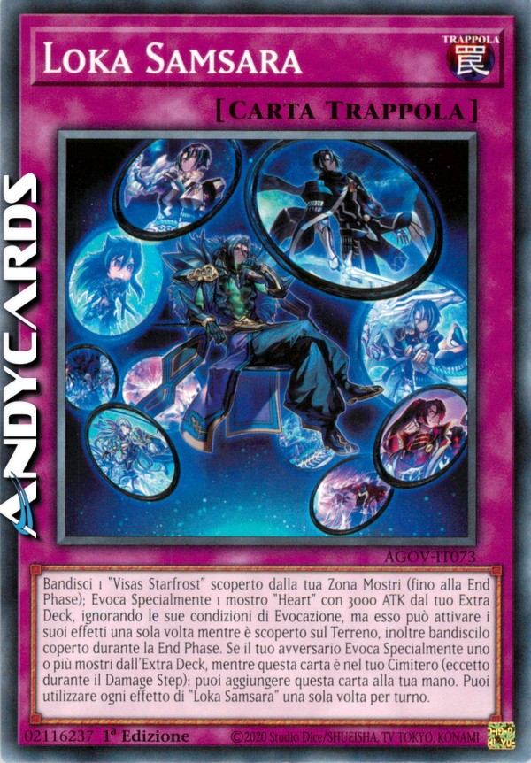 Bandisci 1 "Visas Starfrost" scoperto dalla tua Zona Mostri (fino alla End Phase); Evoca Specialmente 1 mostro "Heart" con 3000 ATK dal tuo Extra Deck, ignorando le sue condizioni di Evocazione, ma esso può attivare i suoi effetti una sola volta mentre è scoperto sul Terreno, inoltre bandiscilo coperto durante la End Phase. Se il tuo avversario Evoca Specialmente uno o più mostri dall'Extra Deck, mentre questa carta è nel tuo Cimitero (eccetto durante il Damage Step): puoi aggiungere questa carta alla tua mano. Puoi utilizzare ogni effetto di "Loka Samsara" una sola volta per turno.