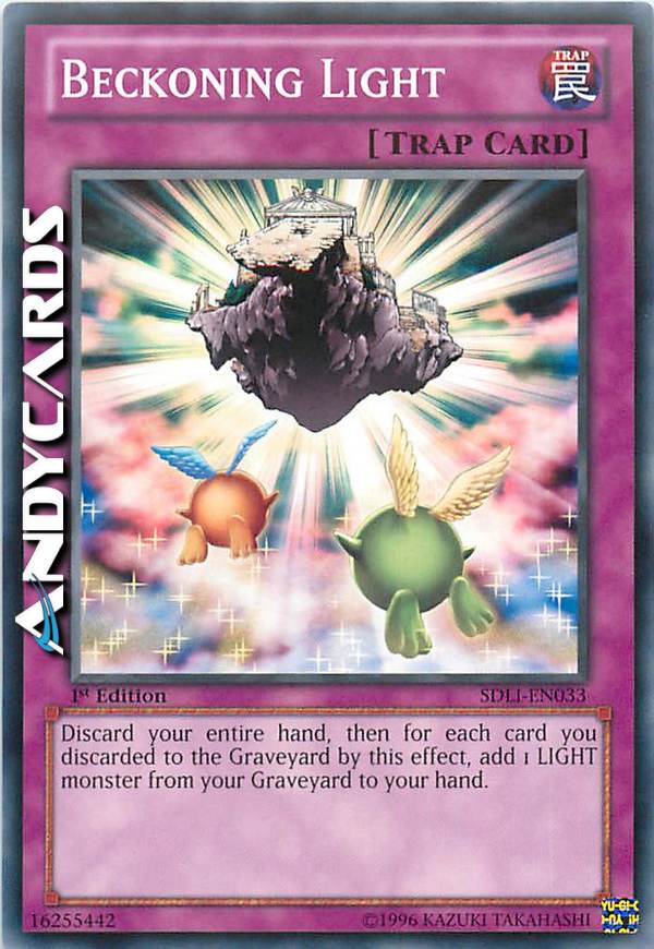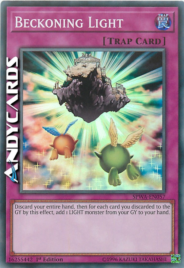 Scarta tutte le carte nella tua mano al cimitero, scegli quindi un numero di mostri Luce dal tuo cimitero pari al numero di carte scartate e aggiungile alla tua mano.