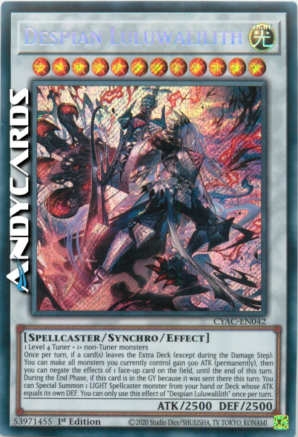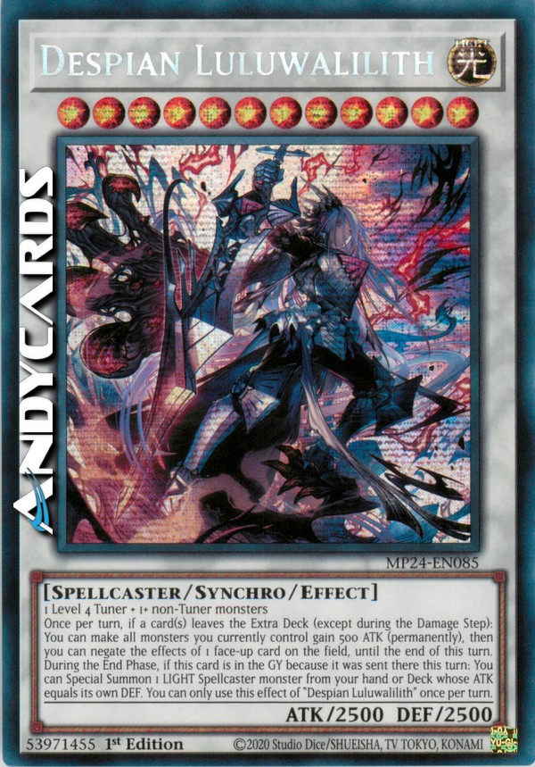 Once per turn, if a card(s) leaves the Extra Deck (except during the Damage Step): You can make all monsters you currently control gain 500 ATK (permanently), then you can negate the effects of 1 face-up card on the field, until the end of this turn. During the End Phase, if this card is in the GY because it was sent there this turn: You can Special Summon 1 LIGHT Spellcaster monster from your hand or Deck whose ATK equals its own DEF. You can only use this effect of "Despian Luluwalilith" once per turn.