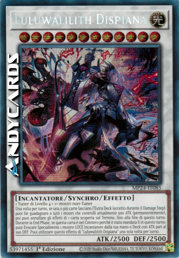 Una volta per turno, se una o più carte lasciano l'Extra Deck (eccetto durante il Damage Step): puoi far guadagnare a tutti i mostri che controlli attualmente 500 ATK (permanentemente), poi puoi annullare gli effetti di 1 carta scoperta sul Terreno, fino alla fine di questo turno. Durante la End Phase, se questa carta è nel Cimitero perché è stata mandata lì in questo turno: puoi Evocare Specialmente 1 mostro LUCE Incantatore dalla tua mano o Deck con ATK pari al suo DEF. Puoi utilizzare questo effetto di "Luluwalilith Dispiana" una sola volta per turno.