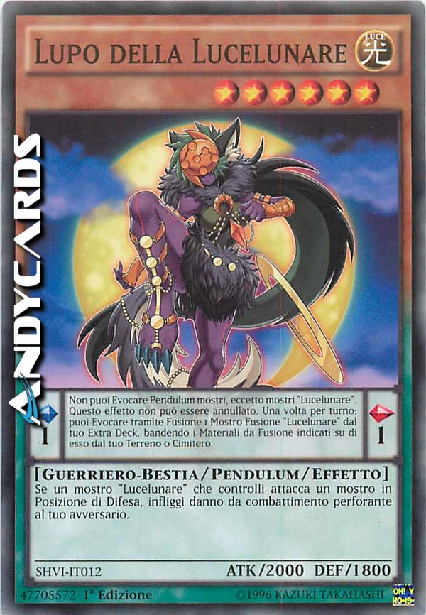 Se un mostro "Lucelunare" che controlli attacca un mostro in Posizione di Difesa, infliggi danno da combattimento perforante al tuo avversario. Non puoi Evocare Pendulum mostri, eccetto mostri "Lucelunare". Questo effetto non può essere annullato. Una volta per turno: puoi Evocare tramite Fusione 1 Mostro Fusione "Lucelunare" dal tuo Extra Deck, bandendo i Materiali da Fusione indicati su di esso dal tuo Terreno o Cimitero.