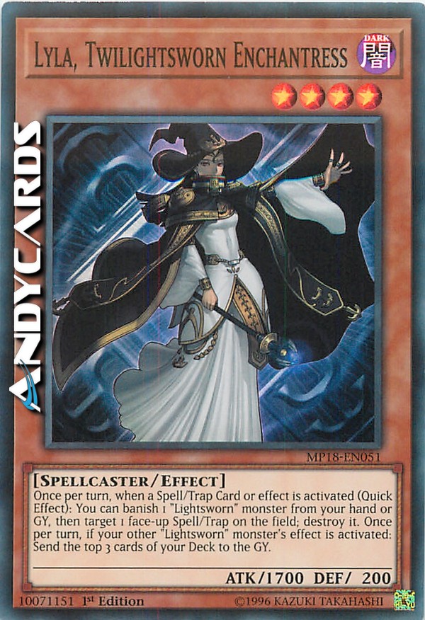 Once per turn, when a Spell/Trap Card or effect is activated (Quick Effect): You can banish 1 "Lightsworn" monster from your hand or GY, then target 1 face-up Spell/Trap on the field; destroy it. Once per turn, if your other "Lightsworn" monster's effect is activated: Send the top 3 cards of your Deck to the GY.