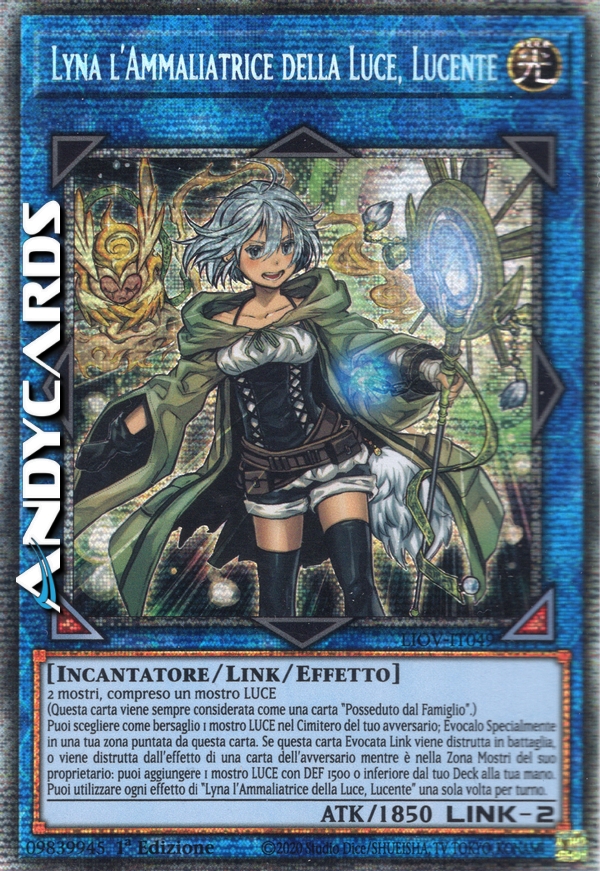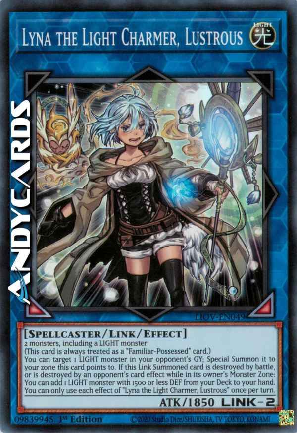 2 mostri, compreso un mostro LUCE (Questa carta viene sempre considerata come una carta "Posseduto dal Famiglio".) Puoi scegliere come bersaglio 1 mostro LUCE nel Cimitero del tuo avversario; Evocalo Specialmente in una tua zona puntata da questa carta. Se questa carta Evocata Link viene distrutta in battaglia, o viene distrutta dall'effetto di una carta dell'avversario mentre è nella Zona Mostri del suo proprietario: puoi aggiungere 1 mostro LUCE con DEF 1500 o inferiore dal tuo Deck alla tua mano. Puoi utilizzare ogni effetto di "Lyna l'Ammaliatrice della Luce, Lucente" una sola volta per turno.