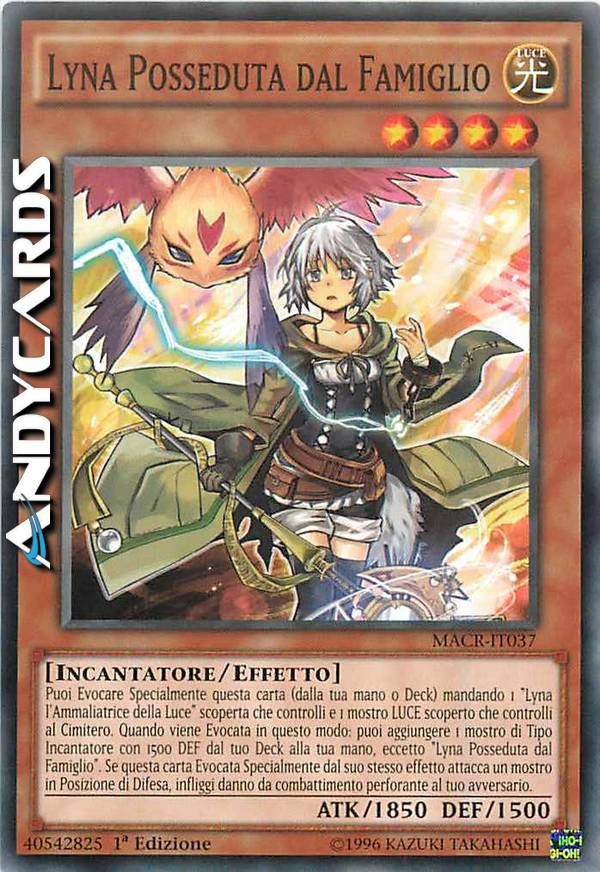 Puoi Evocare Specialmente questa carta (dalla tua mano o Deck) mandando 1 "Lyna l'Ammaliatrice della Luce" scoperta che controlli e 1 mostro LUCE scoperto che controlli al Cimitero. Quando viene Evocata in questo modo: puoi aggiungere 1 mostro di Tipo Incantatore con 1500 DEF dal tuo Deck alla tua mano, eccetto "Lyna Posseduta dal Famiglio". Se questa carta Evocata Specialmente dal suo stesso effetto attacca un mostro in Posizione di Difesa, infliggi danno da combattimento perforante al tuo avversario.