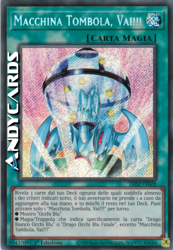 Rivela 3 carte dal tuo Deck ognuna delle quali soddisfa almeno 1 dei criteri indicati sotto, il tuo avversario ne prende 1 a caso da aggiungere alla tua mano, e tu mischi il resto nel tuo Deck. Puoi attivare solo 1 "Macchina Tombola, Vai!!!" per turno.
