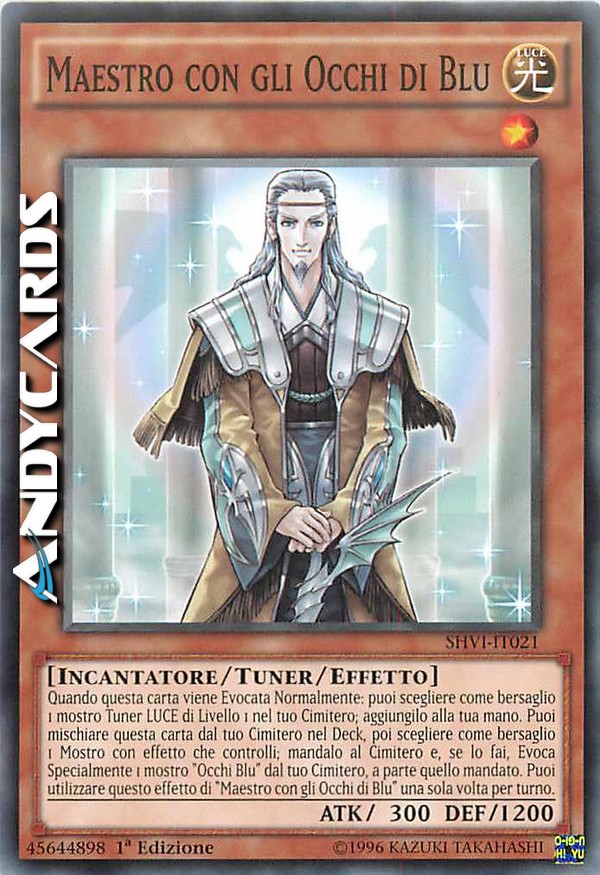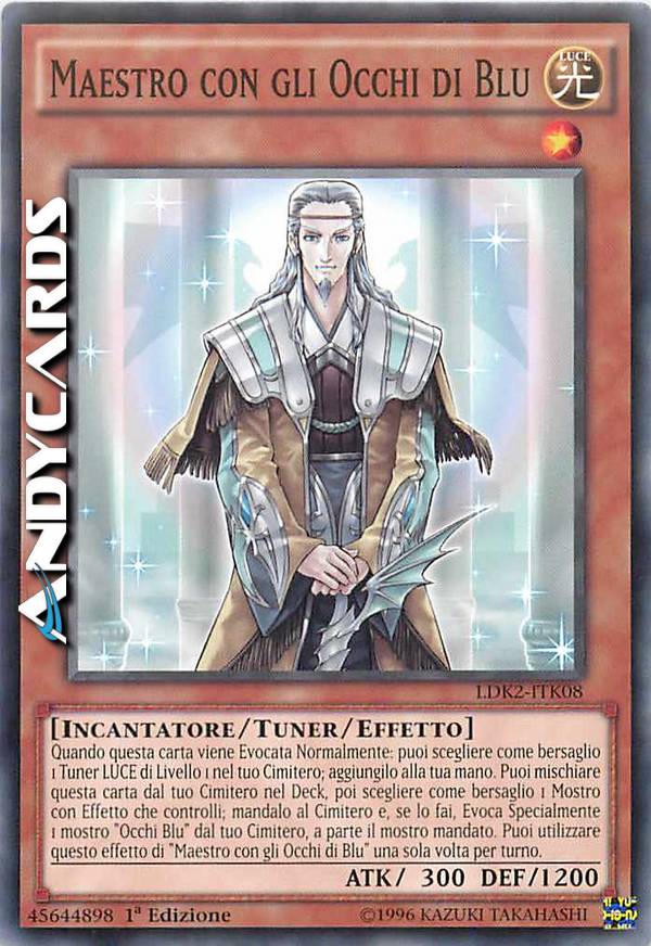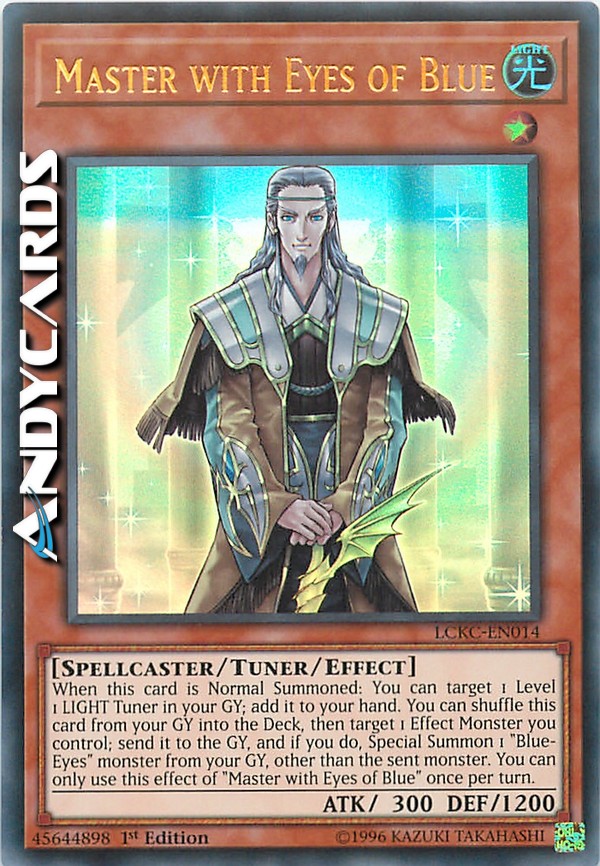 Quando questa carta viene Evocata Normalmente: puoi scegliere come bersaglio 1 Tuner LUCE di Livello 1 nel tuo Cimitero; aggiungilo alla tua mano. Puoi mischiare questa carta dal tuo Cimitero nel Deck, poi scegliere come bersaglio 1 Mostro con Effetto che controlli; mandalo al Cimitero e, se lo fai, Evoca Specialmente 1 mostro "Occhi Blu" dal tuo Cimitero, a parte il mostro mandato. Puoi utilizzare questo effetto di "Maestro con gli Occhi di Blu" una sola volta per turno.