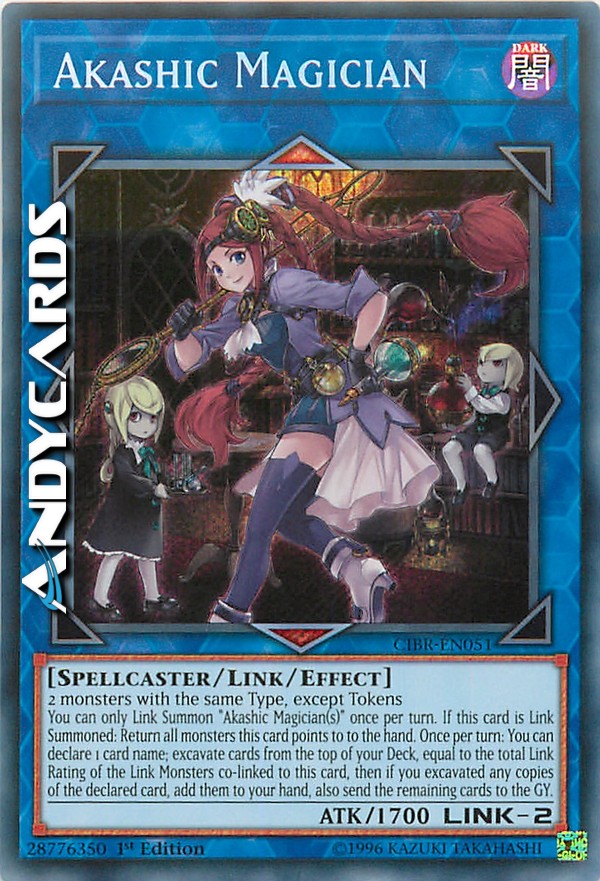 Puoi Evocare Link uno o più "Maga Akashic" una sola volta per turno. Se questa carta viene Evocata Link: fai ritornare nella mano tutti i mostri puntati da questa carta. Una volta per turno: puoi dichiarare il nome di 1 carta; dissotterra dalla cima del tuo Deck carte pari alla somma delle Classificazioni Link dei Mostri Link co-linkati a questa carta, poi se hai dissotterrato qualsiasi copia della carta dichiarata, aggiungila alla tua mano, inoltre manda le carte rimanenti al Cimitero.