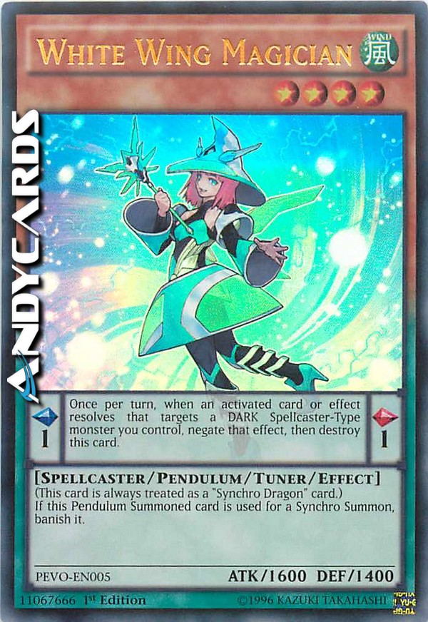 Una volta per turno, quando si risolve una carta o un effetto attivato che sceglie come bersaglio un mostro OSCURITÀ di Tipo Incantatore che controlli, annulla quell'effetto, poi distruggi questa carta. - (Questa carta viene sempre considerata come una carta "Drago Synchro".) - Se questa carta Evocata Pendulum viene utilizzata per una Synchro Evocazione, bandiscila.