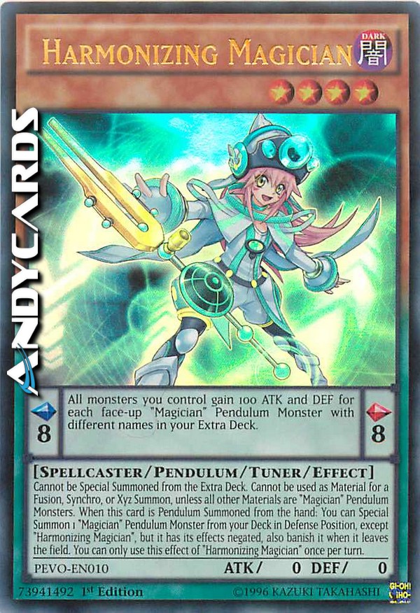 Cannot be Special Summoned from the Extra Deck. Cannot be used as Material for a Fusion, Synchro, or Xyz Summon, unless all other Materials are "Magician" Pendulum Monsters. When this card is Pendulum Summoned from the hand: You can Special Summon 1 "Magician" Pendulum Monster from your Deck in Defense Position, except "Harmonizing Magician", but it has its effects negated, also banish it when it leaves the field. You can only use this effect of "Harmonizing Magician" once per turn. - Pendulum Effect: All monsters you control gain 100 ATK and DEF for each face-up "Magician" Pendulum Monster with different names in your Extra Deck.