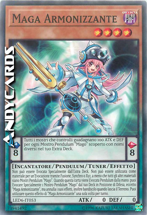 Non può essere Evocato Specialmente dall'Extra Deck. Non può essere utilizzato come Materiale per un'Evocazione tramite Fusione, Synchro o Xyz, a meno che tutti gli altri Materiali siano Mostri Pendulum "Mago". Quando questa carta viene Evocata Pendulum dalla mano: puoi Evocare Specialmente 1 Mostro Pendulum "Mago" dal tuo Deck in Posizione di Difesa, eccetto "Maga Armonizzante", ma i suoi effetti si annullano, inoltre bandiscilo quando lascia il Terreno. Puoi utilizzare questo effetto di "Maga Armonizzante" una sola volta per turno.