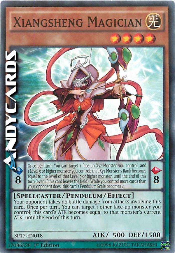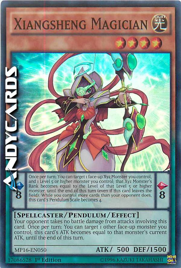 Your opponent takes no battle damage from attacks involving this card. Once per turn: You can target 1 other face-up monster you control; this card's ATK becomes equal to that monster's current ATK, until the end of this turn. Pendulum Effect: Once per turn: You can target 1 face-up Xyz Monster you control, and 1 Level 5 or higher monster you control; that Xyz Monster's Rank becomes equal to the Level of that Level 5 or higher monster, until the end of this turn (even if this card leaves the field). While you control more cards than your opponent does, this card's Pendulum Scale becomes 4.
