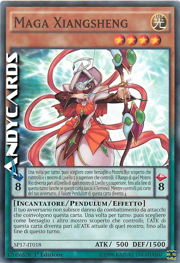 Il tuo avversario non subisce danno da combattimento da attacchi che coinvolgono questa carta. Una volta per turno: puoi scegliere come bersaglio 1 altro mostro scoperto che controlli; l'ATK di questa carta diventa pari all'ATK attuale di quel mostro, fino alla fine di questo turno. Effetto Pendulum: Una volta per turno: puoi scegliere come bersaglio 1 Mostro Xyz scoperto che controlli e 1 mostro di Livello 5 o superiore che controlli; il Rango di quel Mostro Xyz diventa pari al Livello di quel mostro di Livello 5 o superiore, fino alla fine di questo turno (anche se questa carta lascia il Terreno). Mentre controlli più carte del tuo avversario, il Valore Pendulum di questa carta diventa 4.