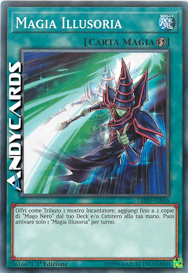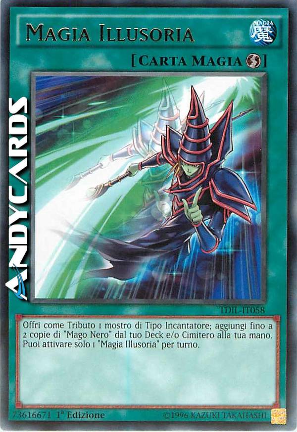 Offri come Tributo 1 mostro Incantatore; aggiungi fino a 2 copie di "Mago Nero" dal tuo Deck e/o Cimitero alla tua mano. Puoi attivare solo 1 "Magia Illusoria" per turno.