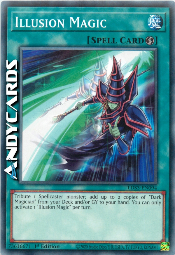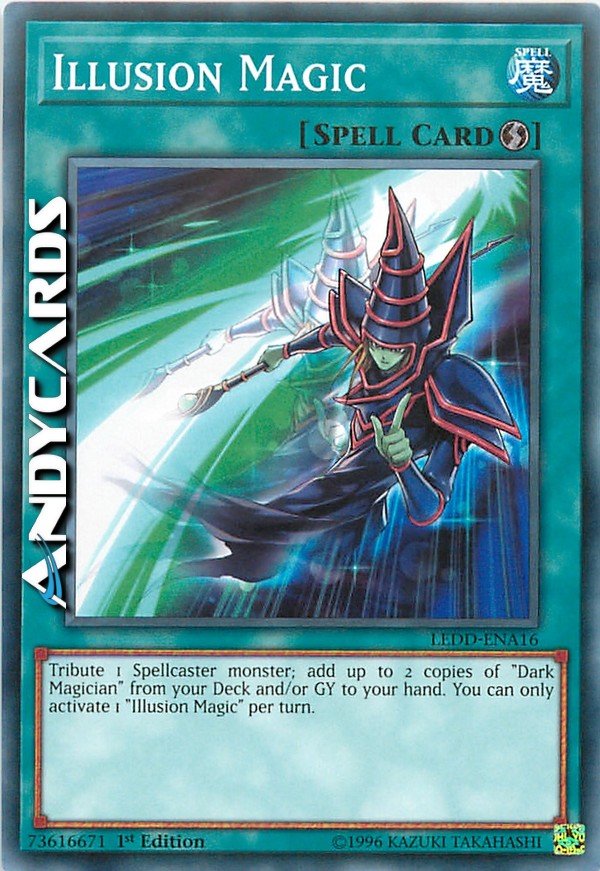 Tribute 1 Spellcaster monster; add up to 2 copies of "Dark Magician" from your Deck and/or GY to your hand. You can only activate 1 "Illusion Magic" per turn.