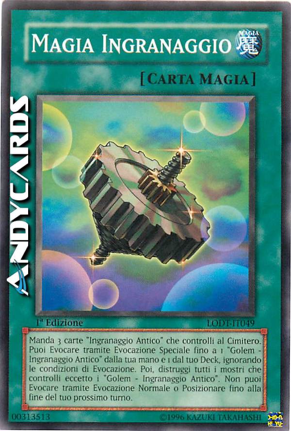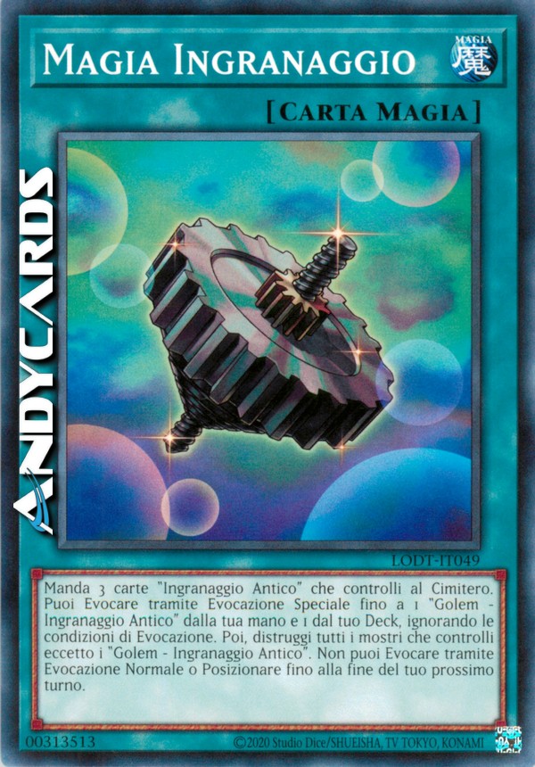 Manda 3 carte "Ingranaggio Antico" che controlli al Cimitero. Puoi Evocare tramite Evocazione Speciale fino a 1 "Golem - Ingranaggio Antico" dalla tua mano e 1 dal tuo Deck, ignorando le condizioni di Evocazione. Poi, distruggi tutti i mostri che controlli, eccetto i "Golem - Ingranaggio Antico". Non puoi Evocare tramite Evocazione normale o Posizionare fino alla fine del tuo prossimo turno.