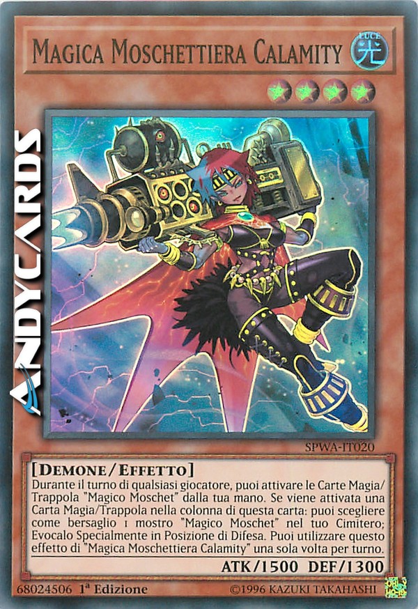 Durante il turno di qualsiasi giocatore, puoi attivare le Carte Magia/Trappola "Magico Moschet" dalla tua mano. Se viene attivata una Carta Magia/Trappola nella colonna di questa carta: puoi scegliere come bersaglio 1 mostro "Magico Moschet" nel tuo Cimitero; Evocalo Specialmente in Posizione di Difesa. Puoi utilizzare questo effetto di "Magica Moschettiera Calamity" una sola volta per turno.