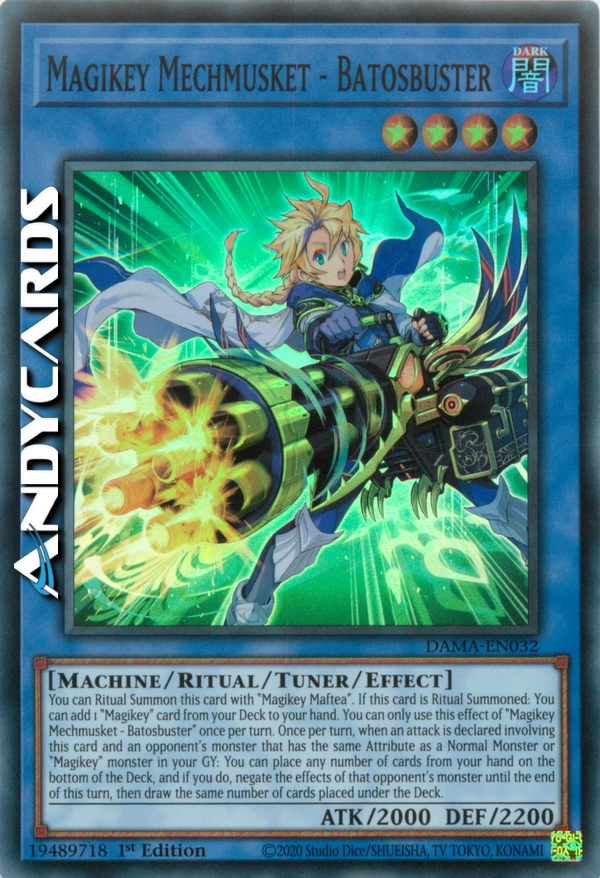 You can Ritual Summon this card with "Magikey Maftea". If this card is Ritual Summoned: You can add 1 "Magikey" card from your Deck to your hand. You can only use this effect of "Magikey Mechmusket - Batosbuster" once per turn. Once per turn, when an attack is declared involving this card and an opponent's monster that has the same Attribute as a Normal Monster or "Magikey" monster in your GY: You can place any number of cards from your hand on the bottom of the Deck, and if you do, negate the effects of that opponent's monster until the end of this turn, then draw the same number of cards placed under the Deck.