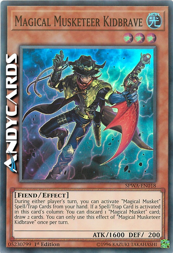 During either player's turn, you can activate "Magical Musket" Spell/Trap Cards from your hand. If a Spell/Trap Card is activated in this card's column: You can discard 1 "Magical Musket" card; draw 2 cards. You can only use this effect of "Magical Musketeer Kidbrave" once per turn.
