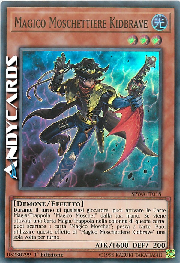 Durante il turno di qualsiasi giocatore, puoi attivare le Carte Magia/Trappola "Magico Moschet" dalla tua mano. Se viene attivata una Carta Magia/Trappola nella colonna di questa carta: puoi scartare 1 carta "Magico Moschet"; pesca 2 carte. Puoi utilizzare questo effetto di "Magico Moschettiere Kidbrave" una sola volta per turno.