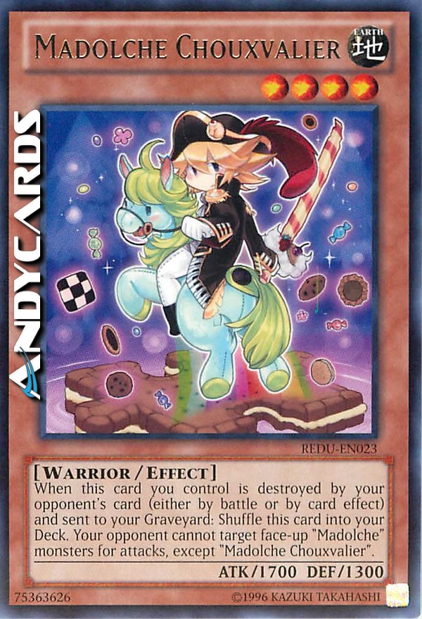 When this card you control is destroyed by your opponent's card (either by battle or by card effect) and sent to your Graveyard: Shuffle this card into your Deck. Your opponent cannot target face-up "Madolche" monsters you control for attacks, except "Madolche Chouxvalier".