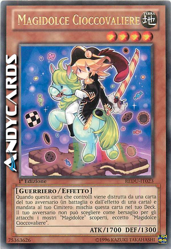 Quando questa carta che controlli viene distrutta da una carta del tuo avversario (in battaglia o dall'effetto di una carta) e mandata al tuo Cimitero: mischia questa carta nel tuo Deck. Il tuo avversario non può scegliere come bersaglio per gli attacchi i mostri "Magidolce" scoperti, eccetto "Magidolce Cioccovaliere".