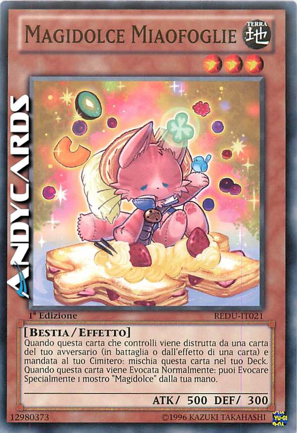 Quando questa carta che controlli viene distrutta da una carta del tuo avversario (in battaglia o dall'effetto di una carta) e mandata al tuo Cimitero: mischia questa carta nel tuo Deck. Quando questa carta viene Evocata Normalmente: puoi Evocare Specialmente 1 mostro "Magidolce" dalla tua mano.