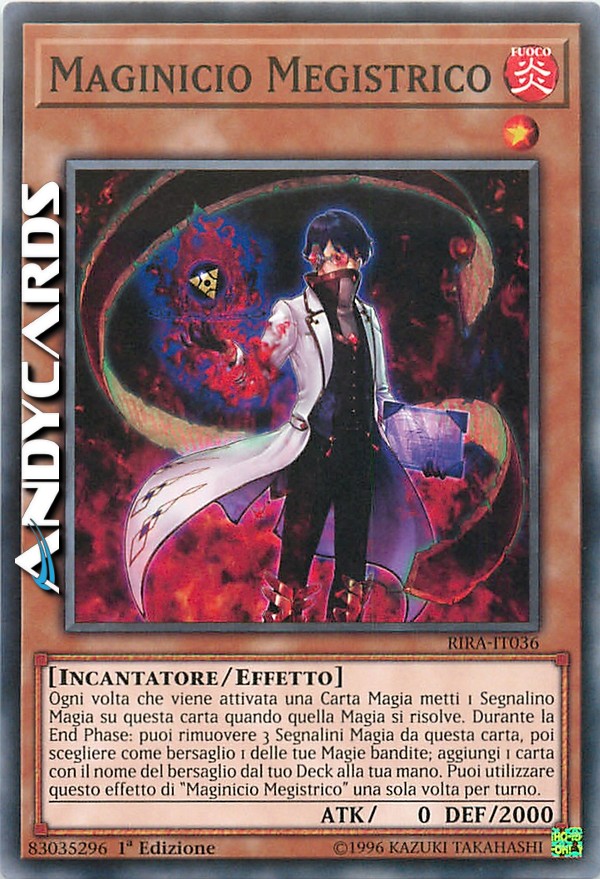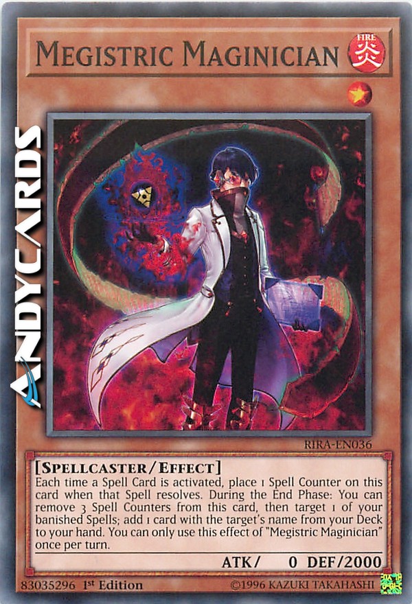 Ogni volta che viene attivata una Carta Magia metti 1 Segnalino Magia su questa carta quando quella Magia si risolve. Durante la End Phase: puoi rimuovere 3 Segnalini Magia da questa carta, poi scegliere come bersaglio 1 delle tue Magie bandite; aggiungi 1 carta con il nome del bersaglio dal tuo Deck alla tua mano. Puoi utilizzare questo effetto di "Maginicio Megistrico" una sola volta per turno.
