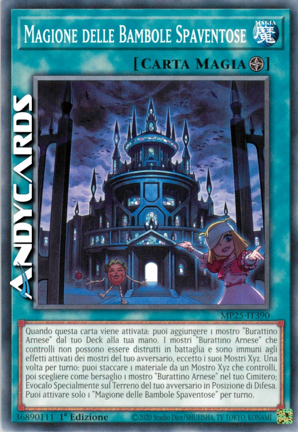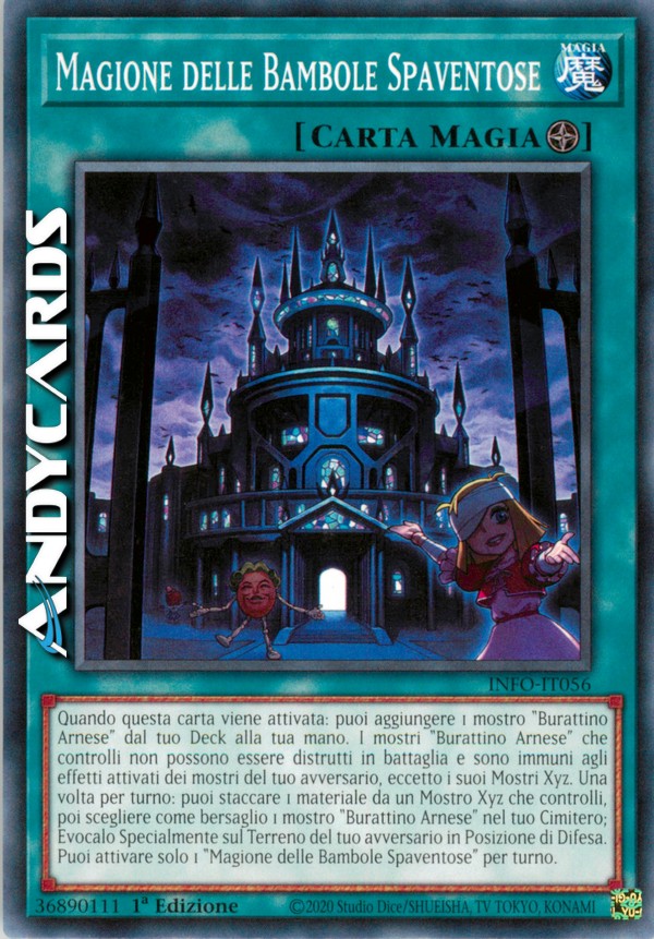 Quando questa carta viene attivata: puoi aggiungere 1 mostro "Burattino Arnese" dal tuo Deck alla tua mano. I mostri "Burattino Arnese" che controlli non possono essere distrutti in battaglia e sono immuni agli effetti attivati dei mostri del tuo avversario, eccetto i suoi Mostri Xyz. Una volta per turno: puoi staccare 1 materiale da un Mostro Xyz che controlli, poi scegliere come bersaglio 1 mostro "Burattino Arnese" nel tuo Cimitero; Evocalo Specialmente sul Terreno del tuo avversario in Posizione di Difesa. Puoi attivare solo 1 "Magione delle Bambole Spaventose" per turno.