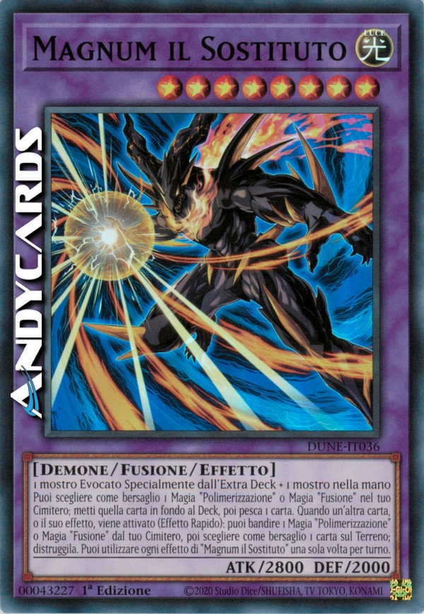 Puoi scegliere come bersaglio 1 Magia "Polimerizzazione" o Magia "Fusione" nel tuo Cimitero; metti quella carta in fondo al Deck, poi pesca 1 carta. Quando un'altra carta, o il suo effetto, viene attivato (Effetto Rapido): puoi bandire 1 Magia "Polimerizzazione" o Magia "Fusione" dal tuo Cimitero, poi scegliere come bersaglio 1 carta sul Terreno; distruggila. Puoi utilizzare ogni effetto di "Magnum il Sostituto" una sola volta per turno.