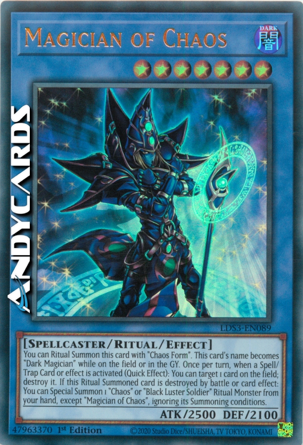 You can Ritual Summon this card with "Chaos Form". This card's name becomes "Dark Magician" while on the field or in the GY. Once per turn, when a Spell/Trap Card or effect is activated (Quick Effect): You can target 1 card on the field; destroy it. If this Ritual Summoned card is destroyed by battle or card effect: You can Special Summon 1 "Chaos" or "Black Luster Soldier" Ritual Monster from your hand, except "Magician of Chaos", ignoring its Summoning conditions.