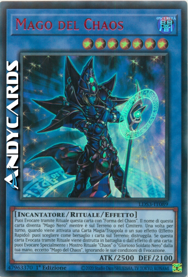 Puoi Evocare tramite Rituale questa carta con "Forma del Chaos". Il nome di questa carta diventa "Mago Nero" mentre è sul Terreno o nel Cimitero. Una volta per turno, quando viene attivata una Carta Magia/Trappola o un suo effetto (Effetto Rapido): puoi scegliere come bersaglio 1 carta sul Terreno; distruggila. Se questa carta Evocata tramite Rituale viene distrutta in battaglia o dall'effetto di una carta: puoi Evocare Specialmente 1 Mostro Rituale "Chaos" o "Glorioso Soldato Nero" dalla tua mano, eccetto "Mago del Chaos", ignorando le sue condizioni di Evocazione.
