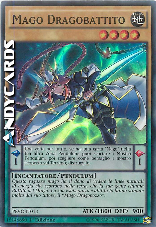 Questo ragazzo mago ha il dono di vedere le linee naturali di energia che scorrono nella terra, che la sua gente chiama Battito del Drago. La sua esuberanza e abilità lo fanno stimare molto dal suo tutore, il "Mago Dragopozzo". - Una volta per turno, se hai una carta "Mago" nella tua altra Zona Pendulum: puoi scartare 1 Mostro Pendulum, poi scegliere come bersaglio 1 mostro scoperto sul Terreno; distruggilo.
